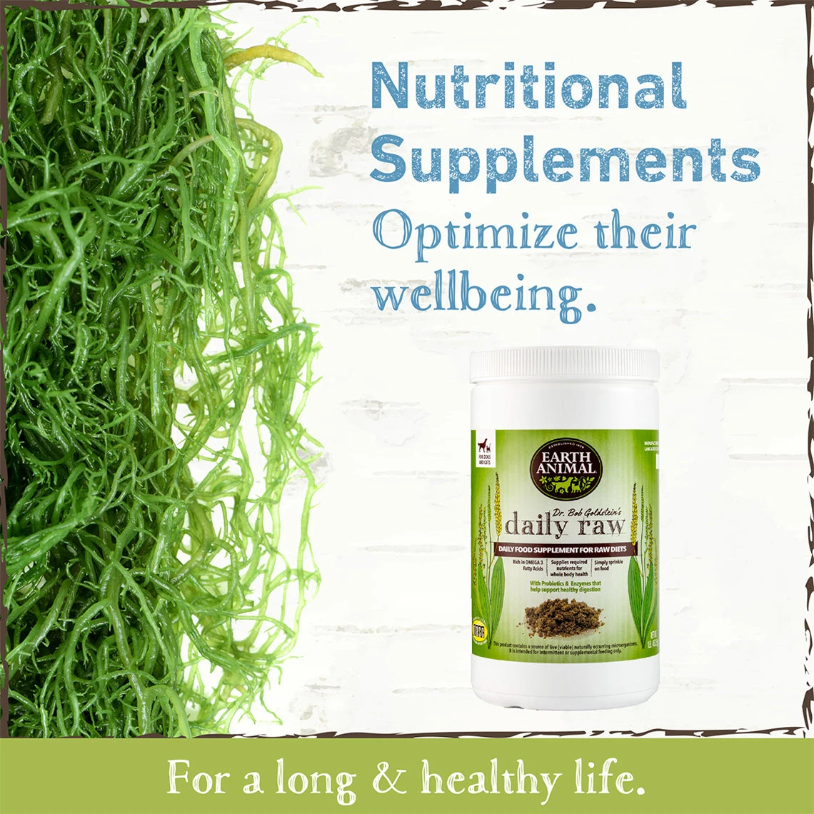 Earth Animal Daily Raw Food Nutritional Supplement Powder is an all-in-one multivitamin plus mineral supplement to add to raw food diets. It contains essential fatty acids, vitamins, minerals, digestive enzymes, probiotics, & high levels of Vitamin E that will give the nutrients necessary when feeding raw food. Dr. Bob Goldstein formulated this well rounded supplement with his 40 years of veterinary experience.Â