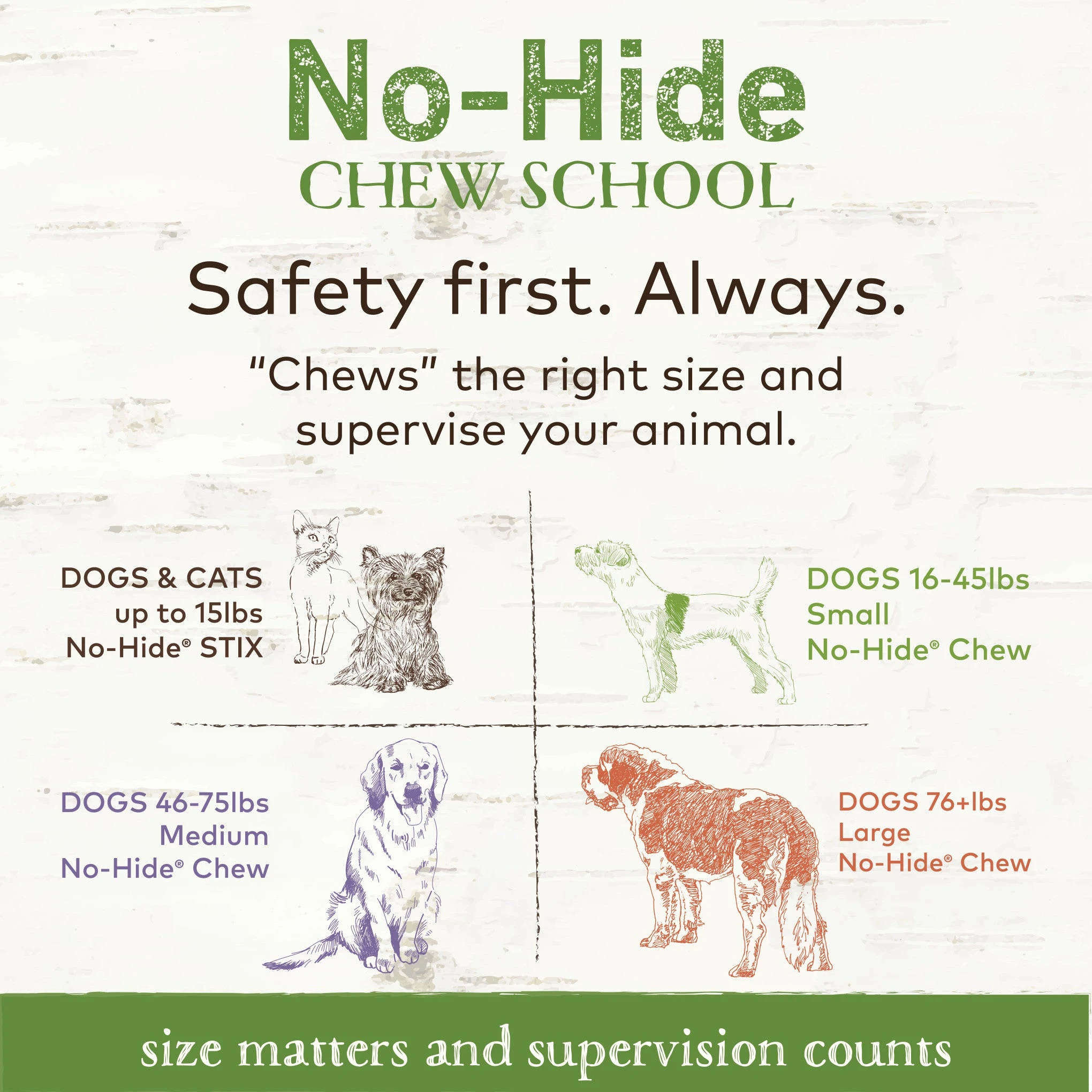 No-Hides are 100% free of rawhide, chemicals, additives, bleaches, and formaldehydes. No-Hide Wholesome Chews are proudly made in the USA. They are carefully blended with 7 pure & simple ingredients, hand-rolled, baked, coated, air-dried & packed with love in Lancaster County, PA.