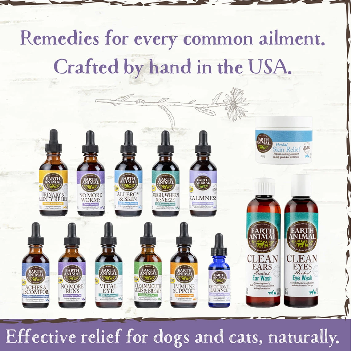 Hand-crafted in the Green Mountains of Vermont, Earth Animal’s Herbal Remedies are made with plants that contain naturally occurring beneficial properties providing healing, comfort, and wellness for the most common conditions dogs and cats experience such as aches & discomfort, allergy & skin issues, anxiety, stress, nervousness, oral health, bad breath, coughing, wheezing, sneezing, immune support, diarrhea, worms, urinary support, kidney support, and eye irritation.
