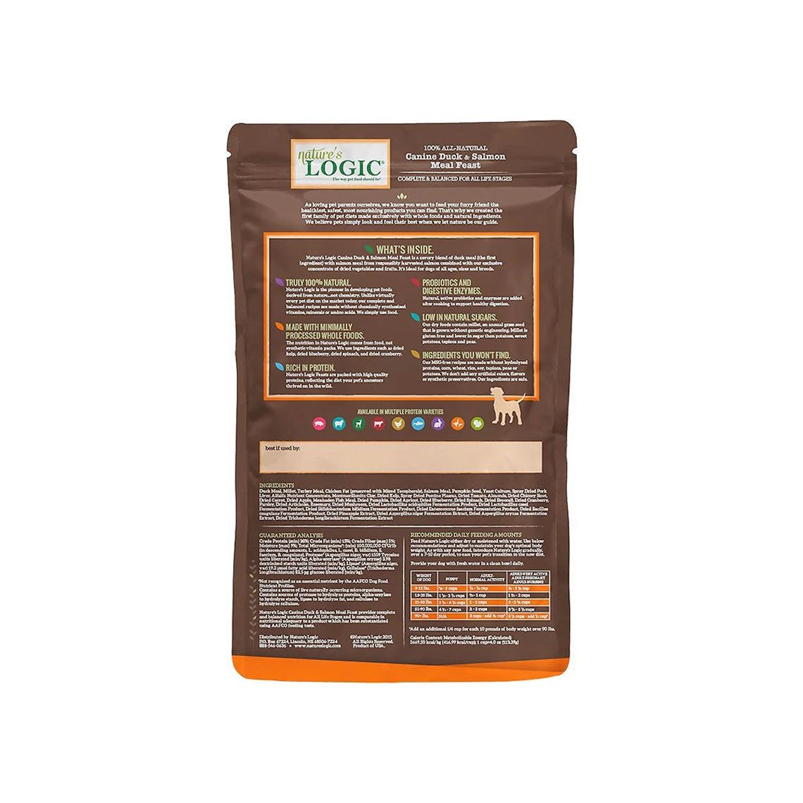 Nature’s Logic Original Duck & Salmon Meal Feast Dry Food for Dogs is a savory blend of duck meal (the first ingredient) with salmon meal combined with our exclusive concentrate of dried vegetables and fruits.
