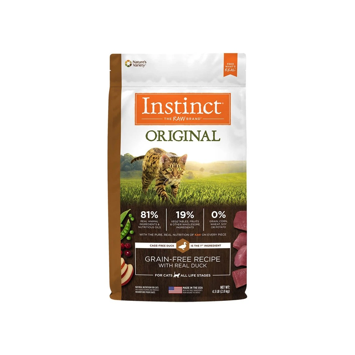 Nature’s Variety Grain-Free Instinct Dry Cat Food grain-free dry diet is high in meat protein and low in carbohydrates, which is ideally suited to cat’ ancestry and biology as natural carnivores. Since cats instinctively crave raw meat, they will choose it over grain when given a choice. Nature’s Variety Raw Instinct, with its high concentration of animal protein, is consistent with the instinctive feline metabolism.