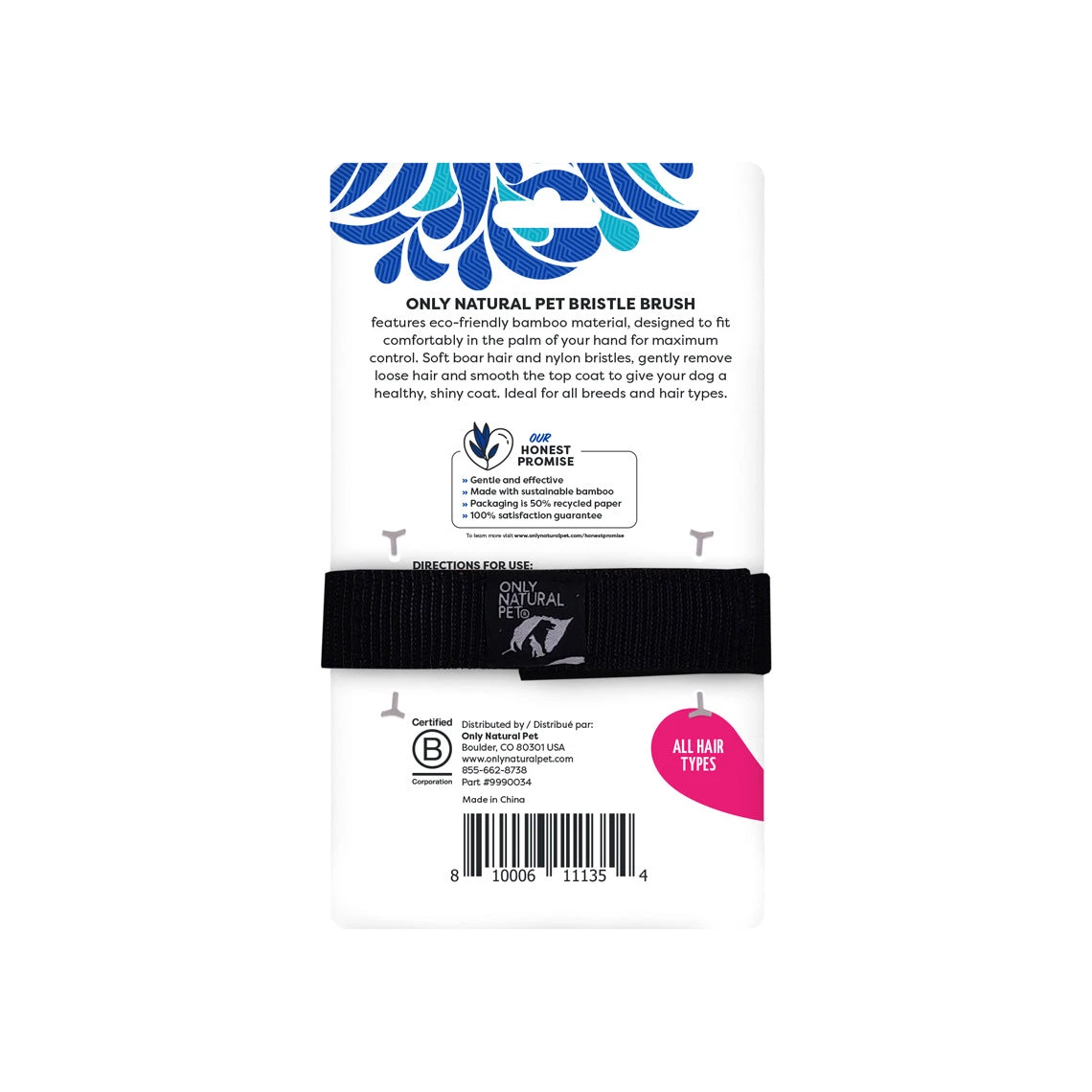 Only Natural Pet Bristle Brush features eco-friendly bamboo material, designed to fit comfortably in the palm of your hand for maximum control. Soft boar hair and nylon bristles, gently remove loose hair and smooth the top coat to give your dog a healthy, shiny coat. Ideal for redistributing natural oils.