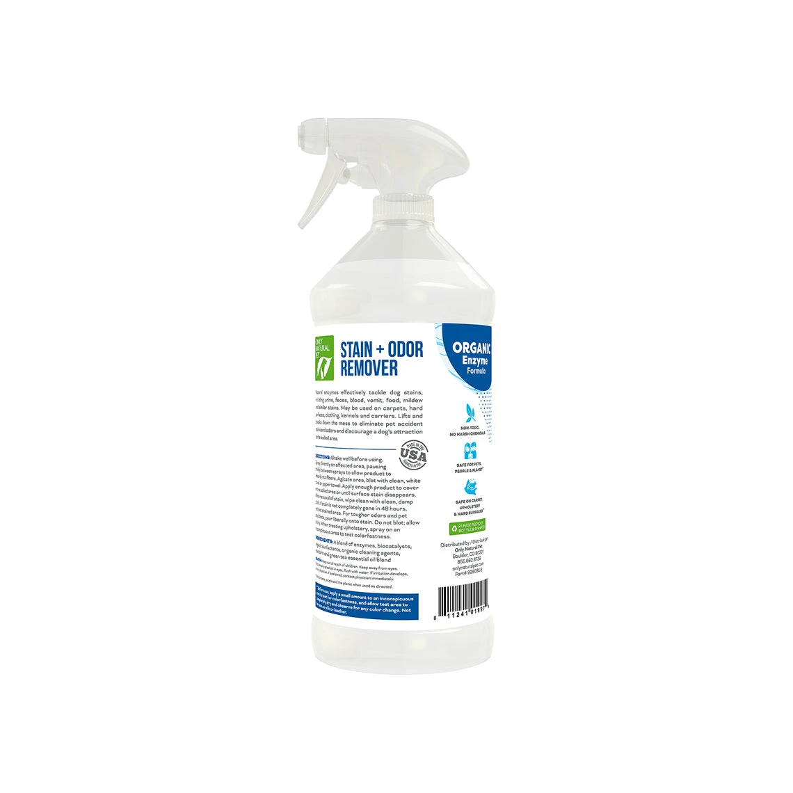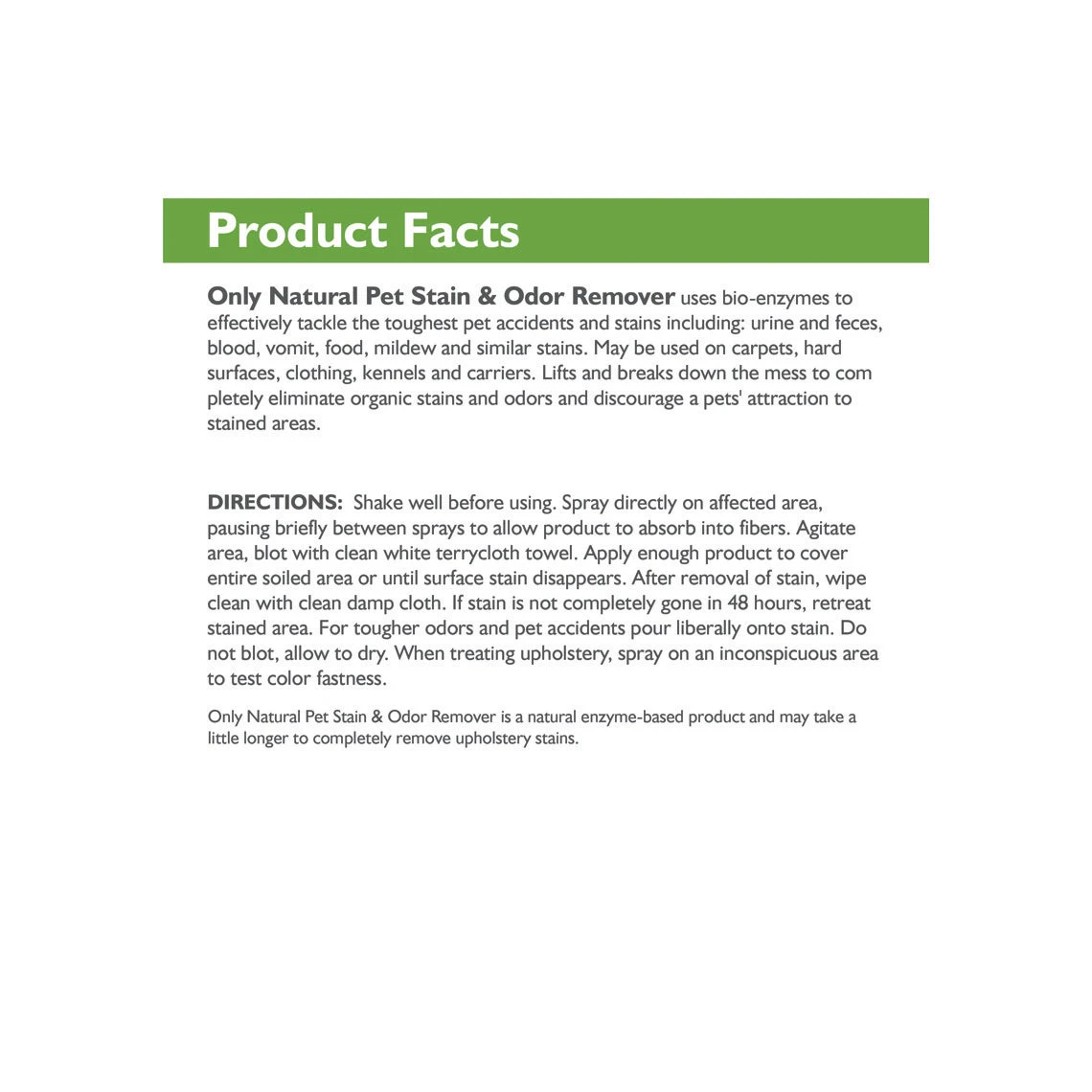 Only Natural Pet Dog Stain & Odor Remover completely eliminate the toughest pet accidents and stains with all natural ingredients. This handy spray uses an effective and unique organic enzyme blend that attacks stains and odors resulting from urine, feces, vomit, blood, food, mildew and similar causes. These, combined with organic surfacants and cleaning agents work to clean carpet, upholstery and hard surfaces.