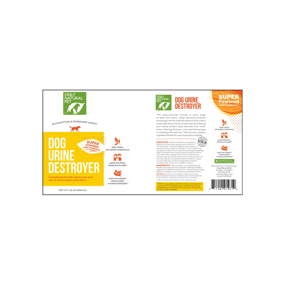 Completely break down new and set-in dog urine stains and odors with the super power of probiotics. Extra tough on stains and odors, this dog urine eliminator works at a molecular level, breaking down urine and leaving your soiled surfaces clean and odor free. Completely non-toxic and with no harsh chemicals, this formula can be use on carpet, upholstery and hard surfaces (do not use on silk or leather), and is safe for pets, people, and planet. Only Natural Pet Dog Urine Stain & Odor Destroyer features a pleasant eucalyptus and rosemary essential oil scent while the dog urine odor eliminator gets to work.