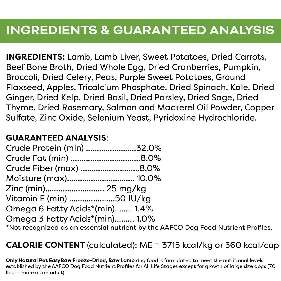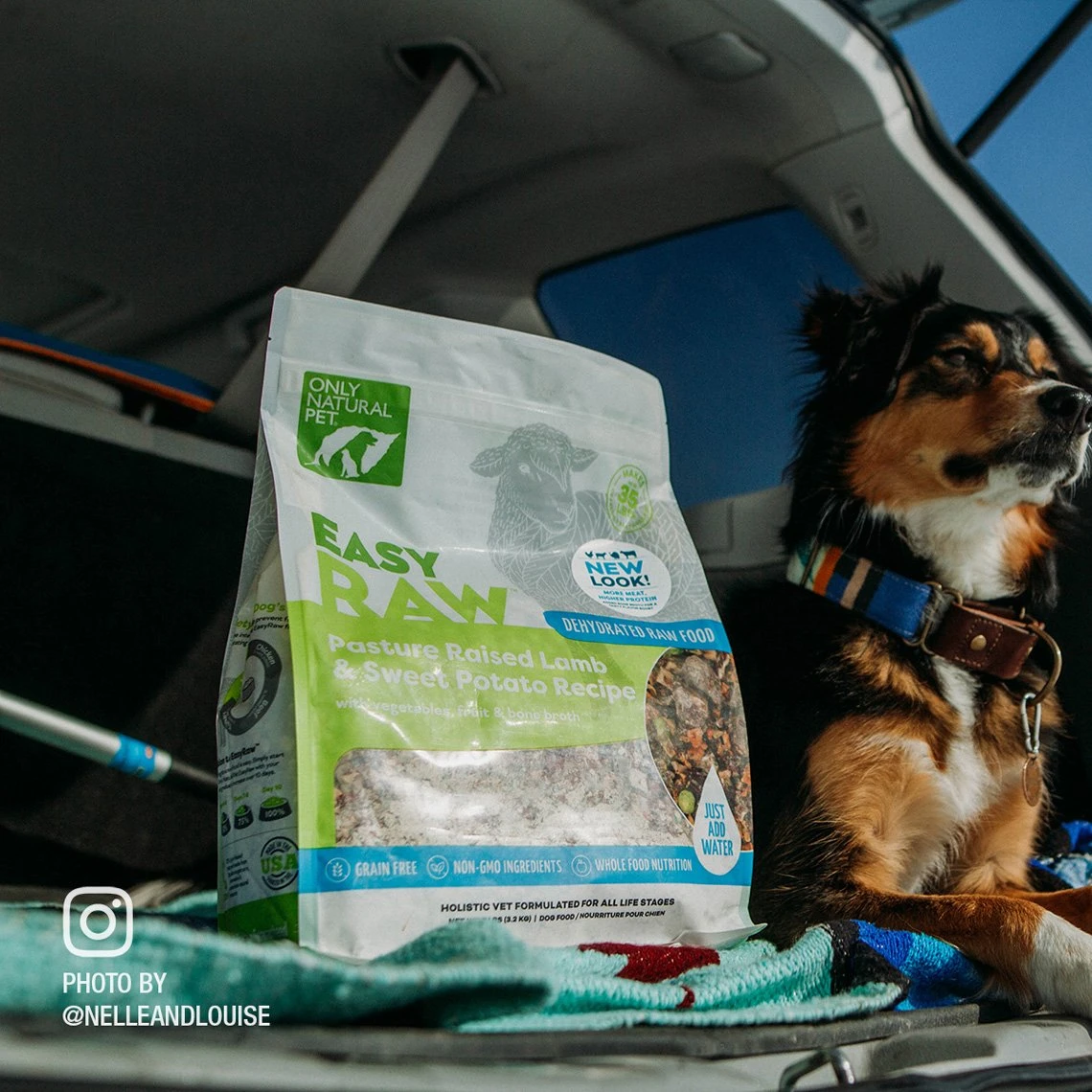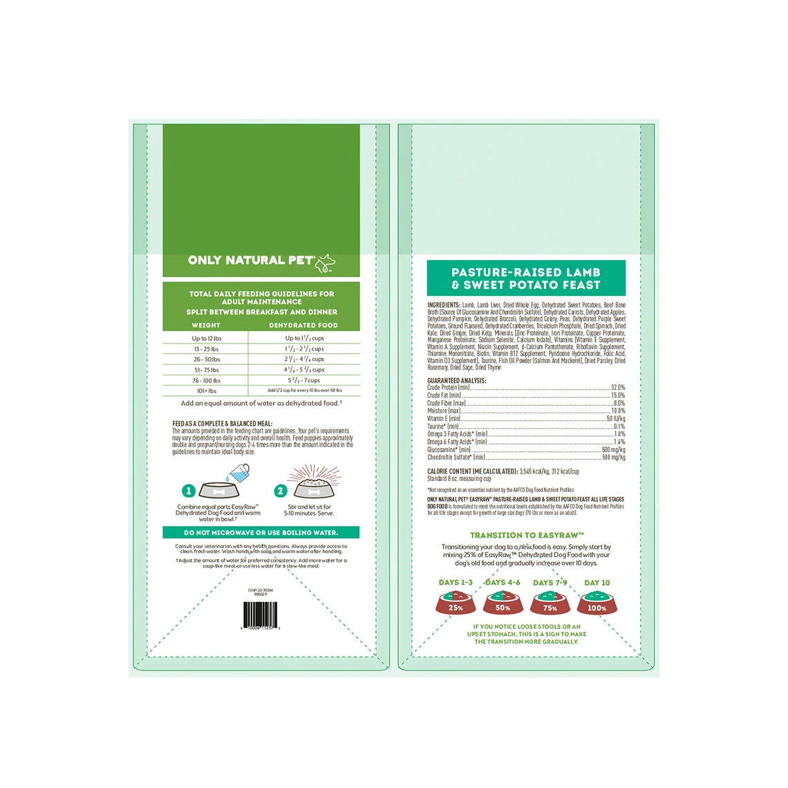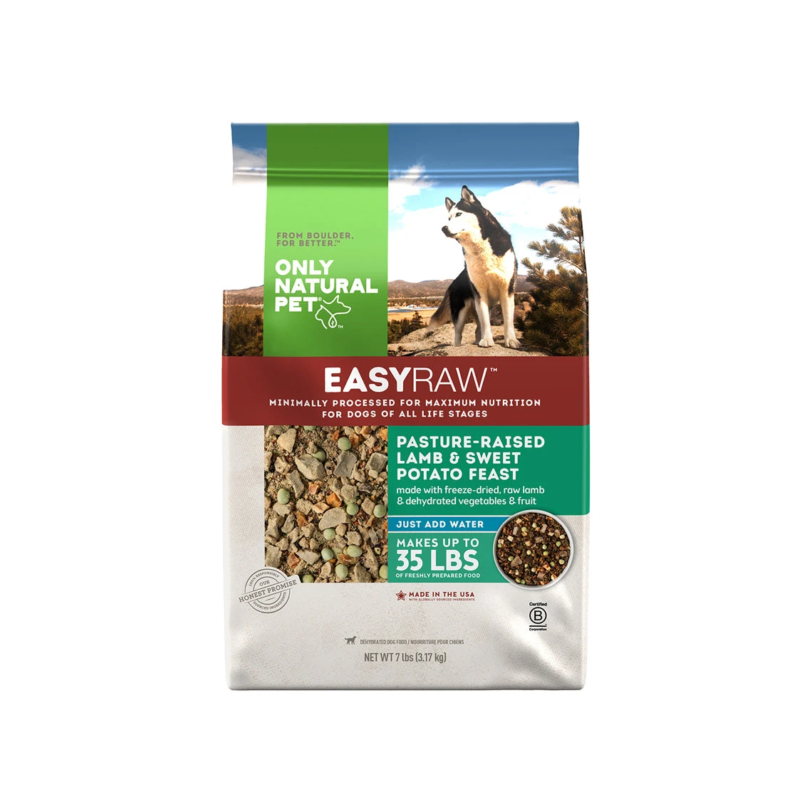 Only Natural Pet EasyRaw Free Range Lamb & Sweet Potato Feast Dehydrated Dog Food is made with freeze-dried, raw lamb and dehydrated vegetables and fruits. These minimally processed ingredients combine for maximum nutrition, freshly prepared meal that is complete and balanced for adult dogs.