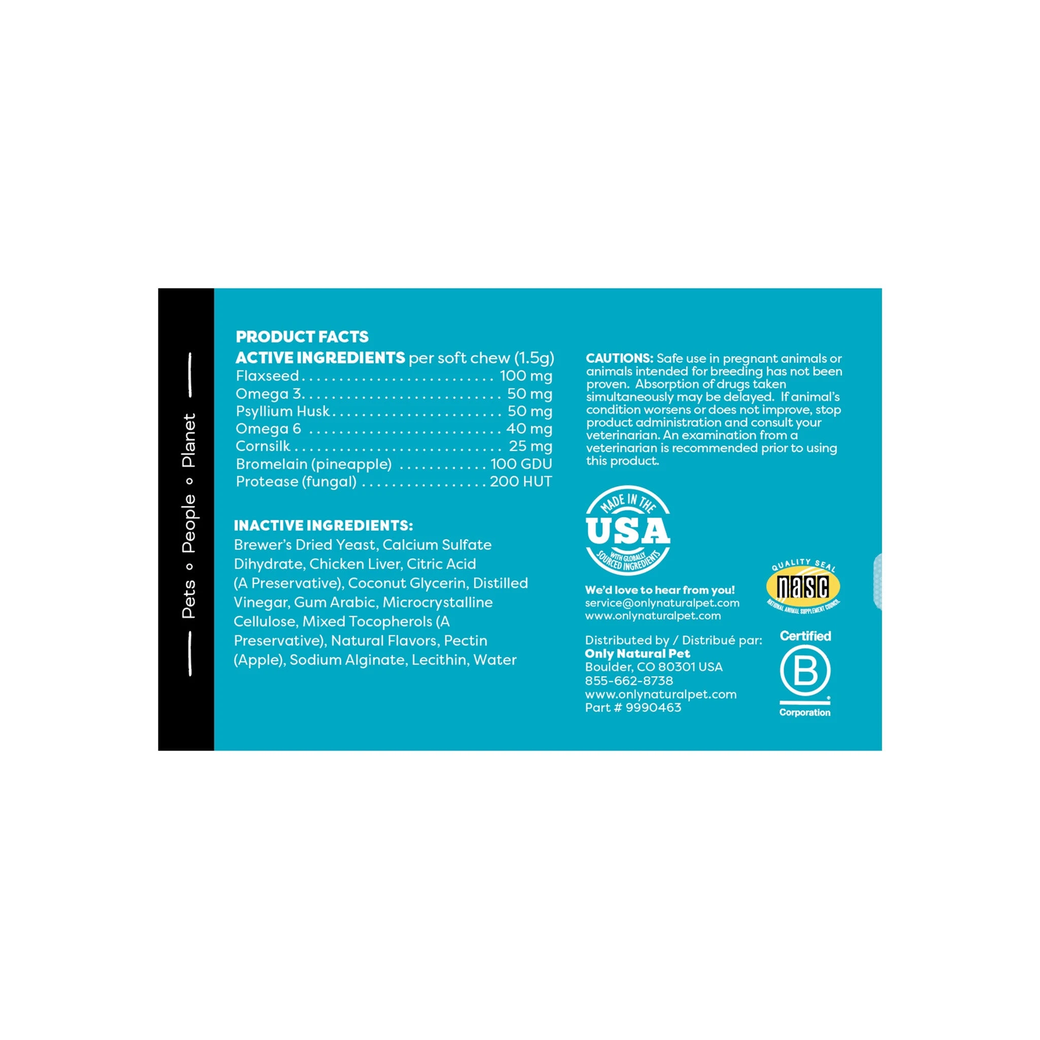 Only Natural Pet Hairball Care Healthy Skin & Coat Support Soft Chews for Cats helps support a healthy G.I. tract and helps maintain a healthy skin & coat so hairball formation is reduced. This hairball supplement for cats contains psyllium husk, Omega 3 & 6’s, and digestive enzymes. These ingredients combine to provide ample nutrients to support skin and digestive health, which limits hairballs