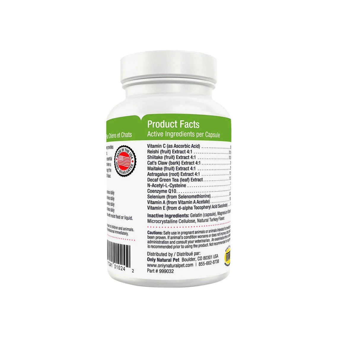 Only Natural Pet Immune Strengthener Support Supplement for Dogs & Cats provides a potent blend of natural vitamins, herbs, antioxidants, and mushrooms to help support essential immune health in pets and help maintain organ health for your pet. Veterinarian formulated, this powder-filled capsule is designed to help support your adult and senior dog or cat.