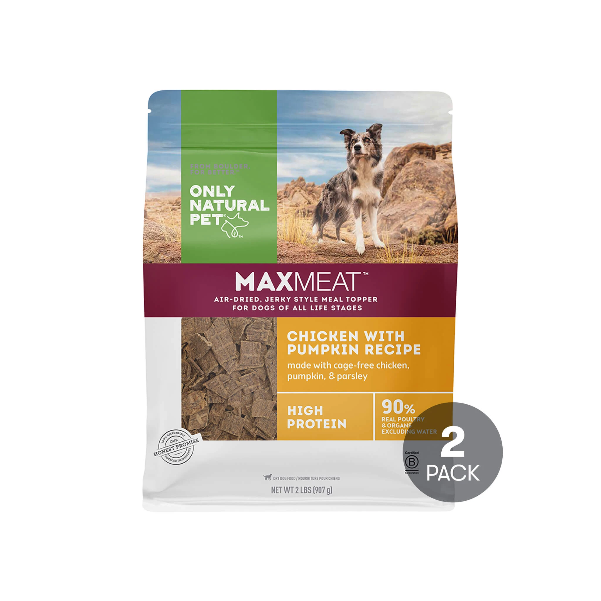 Discover the protein boost of Only Natural Pet MaxMeat Chicken with Pumpkin Recipe Air-Dried Dog Food Topper today!
