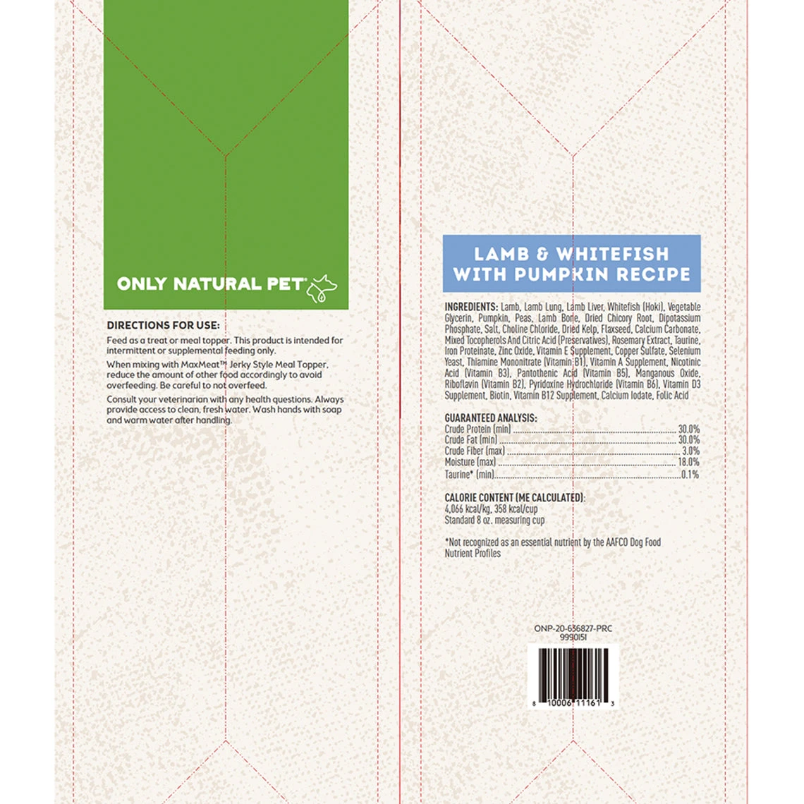 Discover the protein boost of Only Natural Pet MaxMeat Lamb & Whitefish with Pumpkin Recipe Air-Dried Dog Food Topper today!