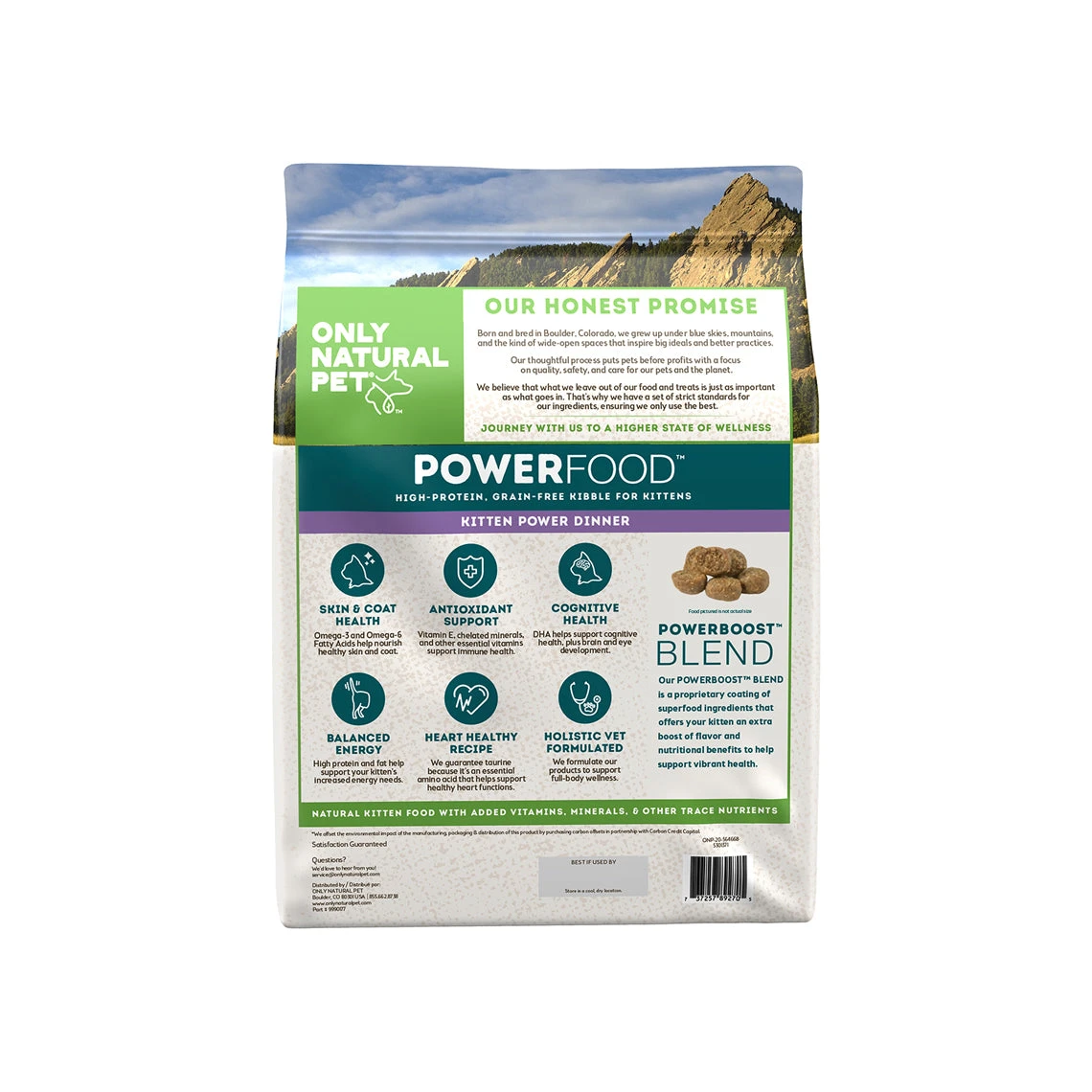 Only Natural Pet PowerFood Kitten Power Dinner Kitten Food is a dry kitten food made with chicken, turkey meal, garbanzo beans, & salmon meal. These ingredients combine for a nutritious meal that features 40% protein and is complete and balanced for growth of all sizes of cats.