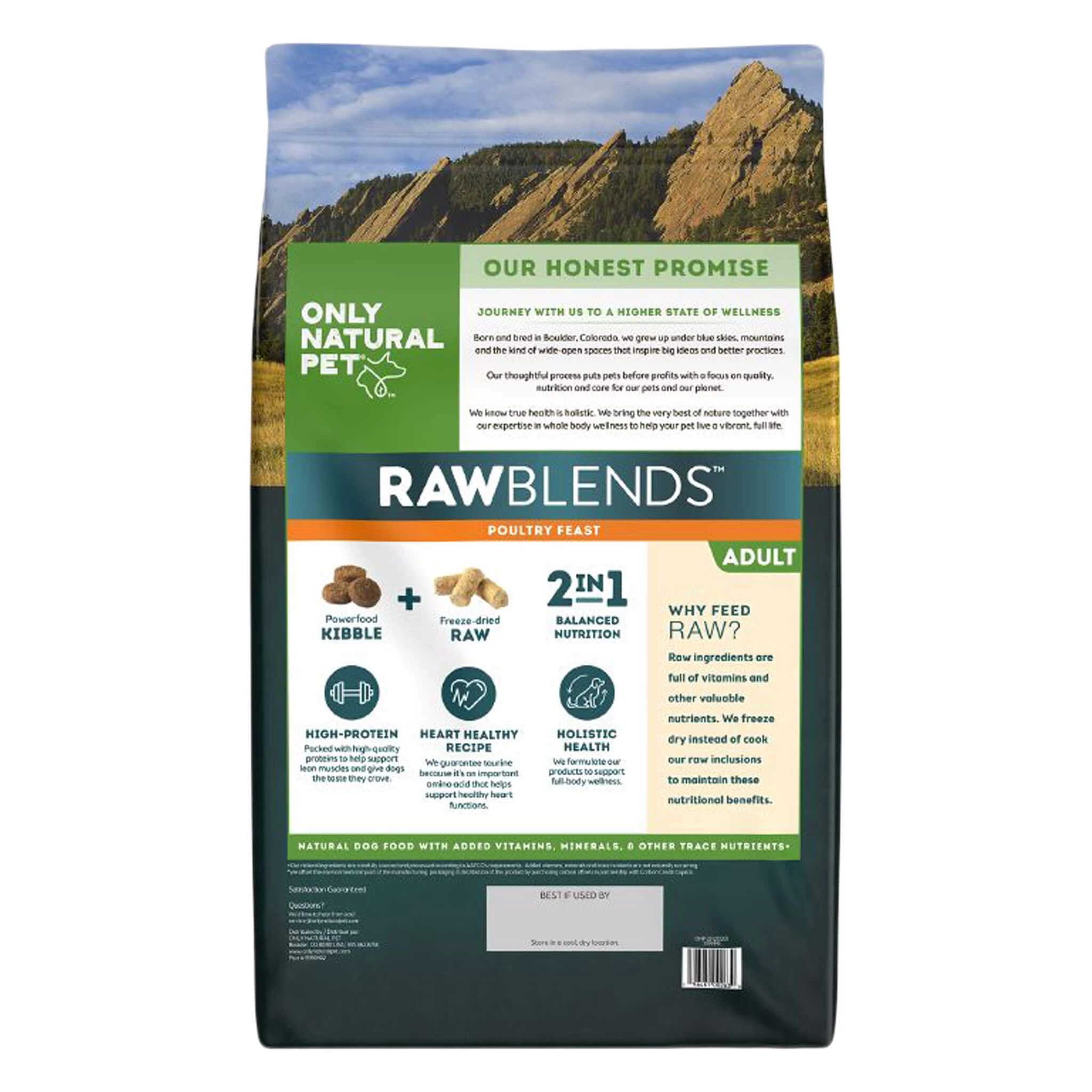 Only Natural Pet Raw Blends Chicken and Poultry Feast is a holistically balanced adult food that blends high-protein chicken, turkey meal, nutritious vegetables and fruits, and freeze-dried raw superfood bites, all in an easy-to-feed dry dog food. Packed with high-quality proteins to help support lean muscles and taurine to support healthy heart function, this raw inclusion kibble is holistic health formulated to support full-body wellness.