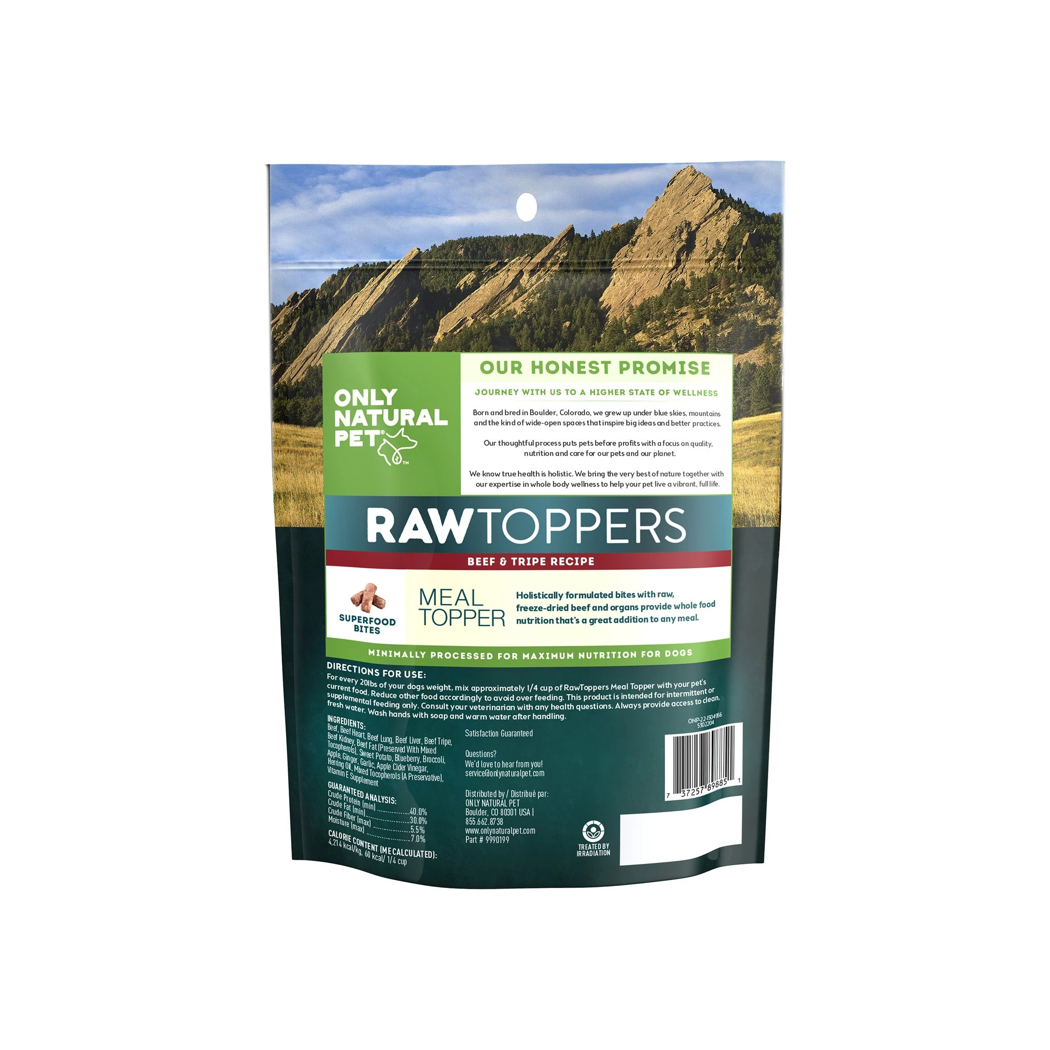 Discover the added taste and nutrition that Only Natural Pet Raw Toppers Freeze-Dried Beef & Tripe Recipe Meal Topper for Dogs can offer today!