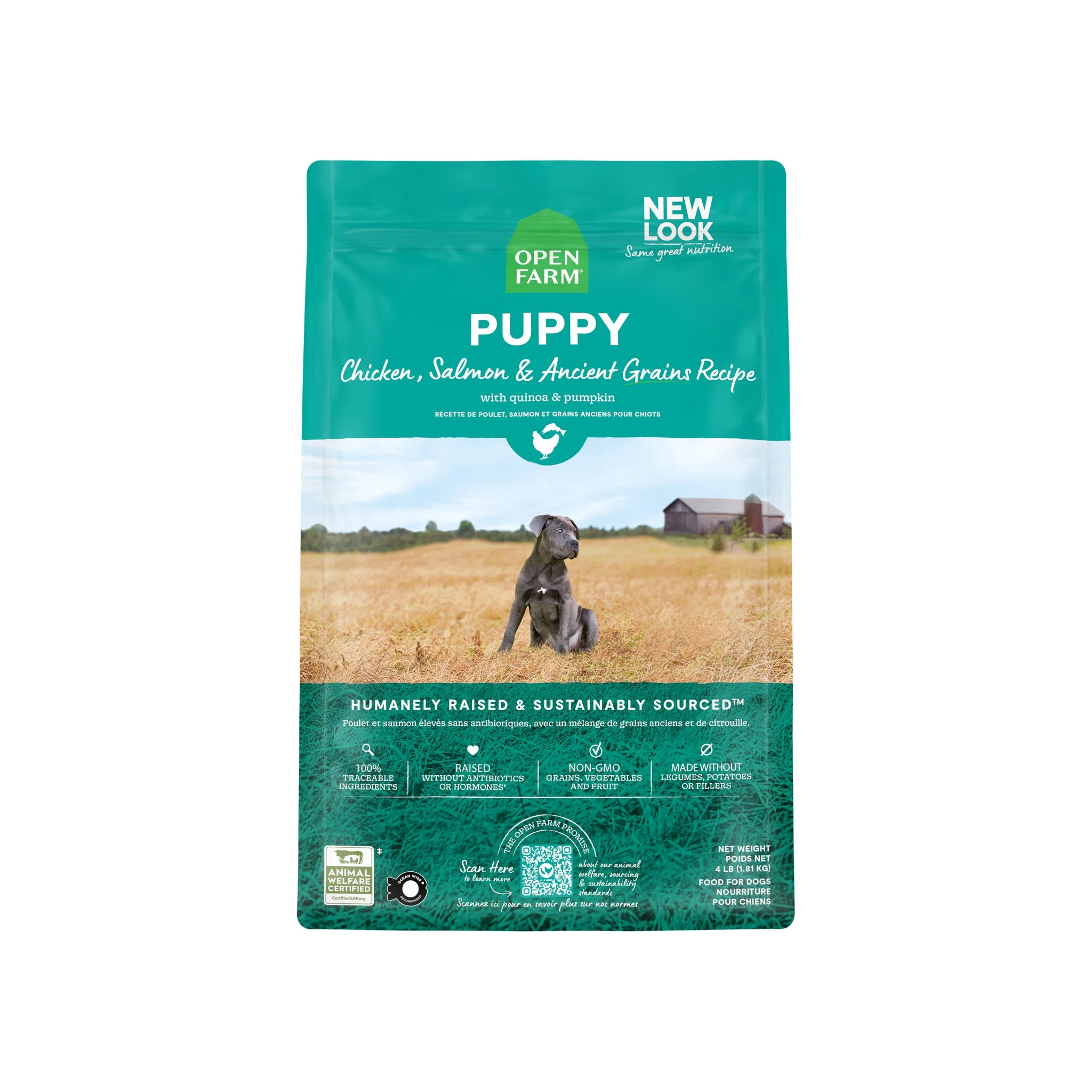 Open Farm Ancient Grains Puppy Dry FoodĀ includes aĀ combination of fresh Pacific wild-caught salmon, ethically raised chicken, pork, and whole ancient grains, this high-protein kibble supports DHA healthy brain development and helps avoid allergies.