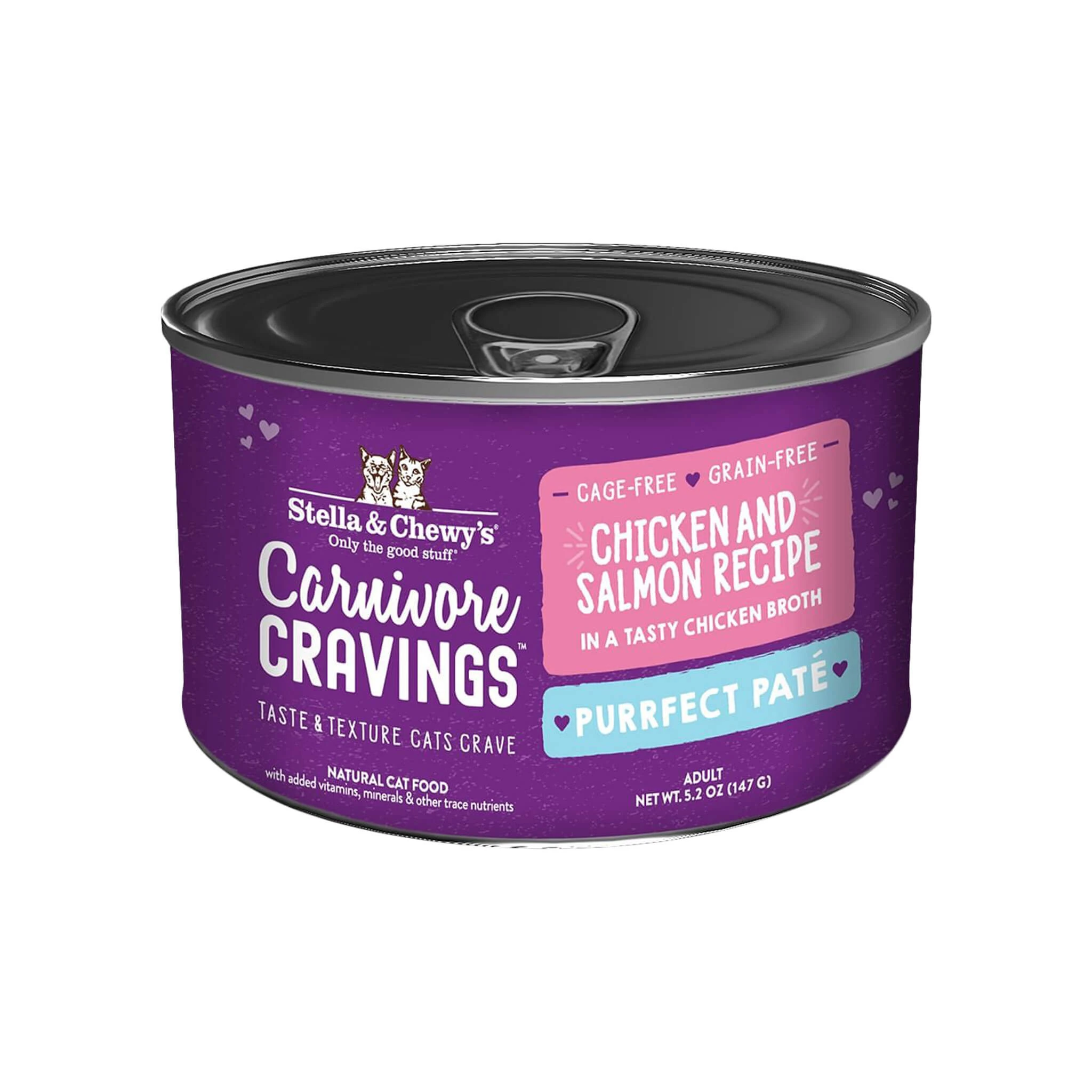 Stella and Chewy’s Carnivore Cravings Purrfect Pate Chicken and Salmon Wet Cat Food is great for adult and senior cats. This chicken and salmon pate cat food is rich in animal protein and low in carbs, focusing on only four to six wholesome ingredients. Cats need to stay hydrated and are not efficient at drinking water, which is why this pate cat food provides essential moisture to keep your cat hydrated.