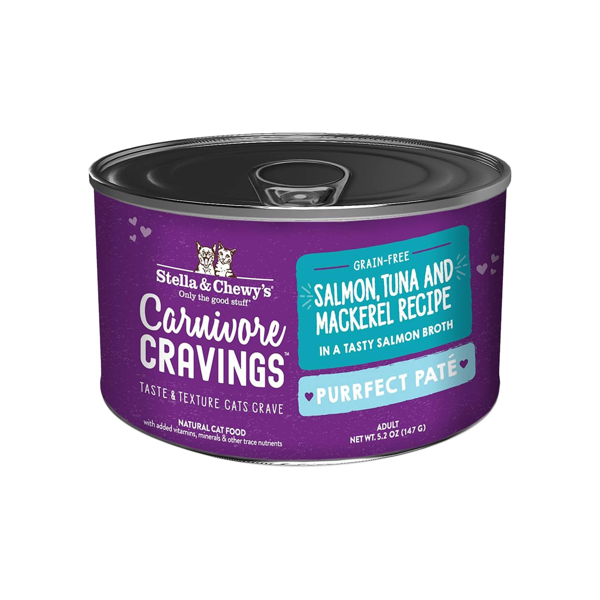 Stella and Chewy’s Carnivore Cravings Purrfect Pate Salmon, Tuna and Mackerel Wet Cat Food is a smooth pate in a tasty salmon broth. Approved by picky cats, this wet cat food is rich in animal protein and low in carbs with added taurine to support overall heart health.