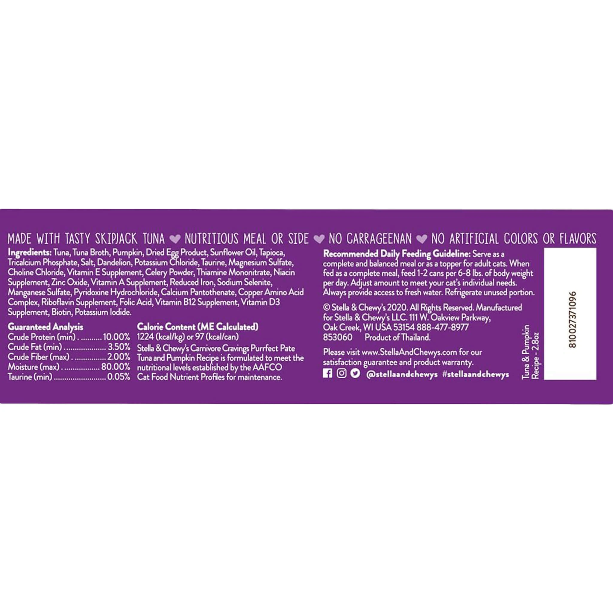 Stella and Chewy’s tuna and pumpkin cat food uses only responsibly sourced ingredients and is free from grains, legumes, potatoes, carrageenan, wheat, meat by-products, soy, artificial colors, preservatives and flavors. There is also added taurine to support overall heart health.