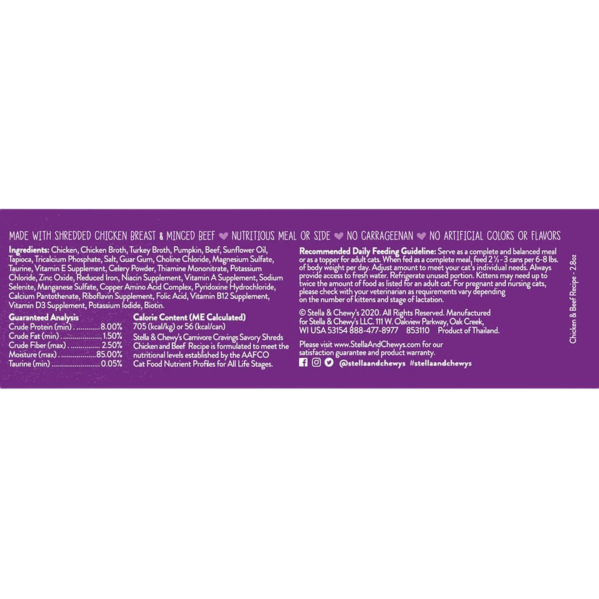 Stella and Chewy’s Carnivore Cravings Savory Shreds Chicken and Beef Wet Cat Food has a texture your cat is sure to love because it is real shredded muscle meat in a light meaty broth. This shredded cat food is rich in animal protein and low in carbs with added taurine to support overall heart health.