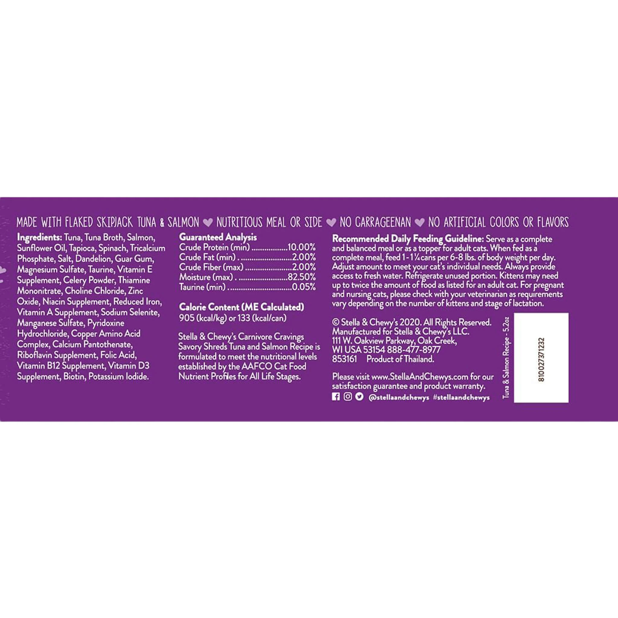 Stella and Chewy’s Carnivore Cravings Savory Shreds Tuna and Salmon Wet Cat Food uses only responsibly sourced ingredients and wild caught fish. This shredded wet cat food uses a tuna broth for the liquid portion, helping add nutrition while keeping your cat hydrated.