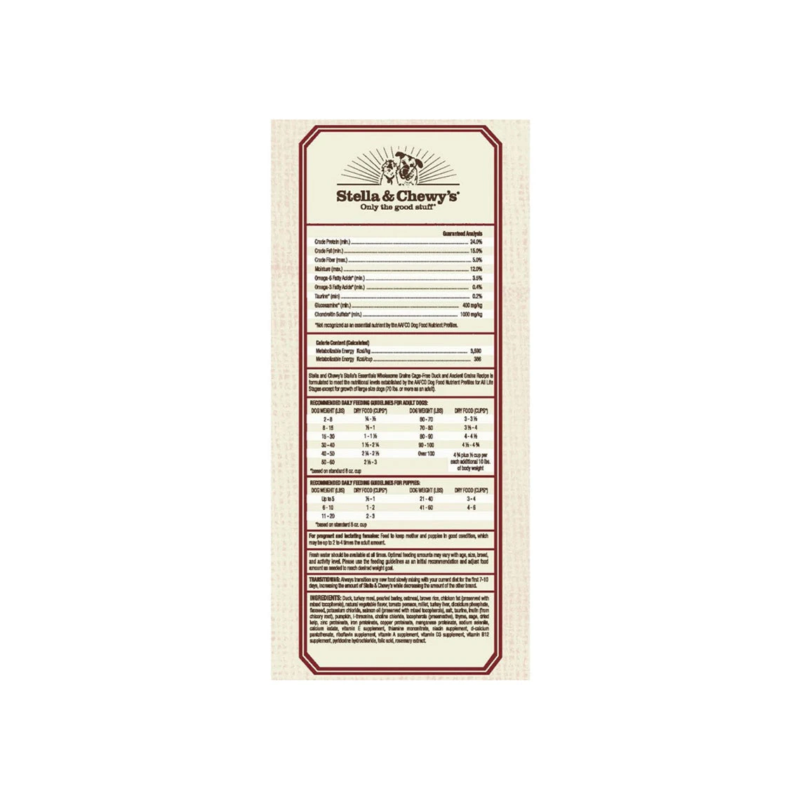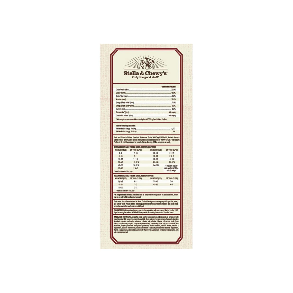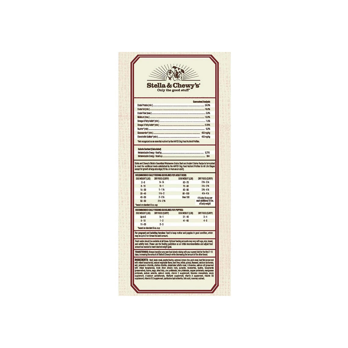 Stella & Chewy’s Essentials Ancient Grain Dry Dog Food features high quality ingredients with added supplements for optimal health. This ancient grain dog food uses responsibly sourced proteins and wholesome grains including pearled barley, oatmeal, brown rice, and millet. Glucosamine and chondroitin are added in industry leading levels to support joint health in order to keep your dog active and feeling good. Taurine levels are guaranteed and aid in your dog’s cardiovascular health.