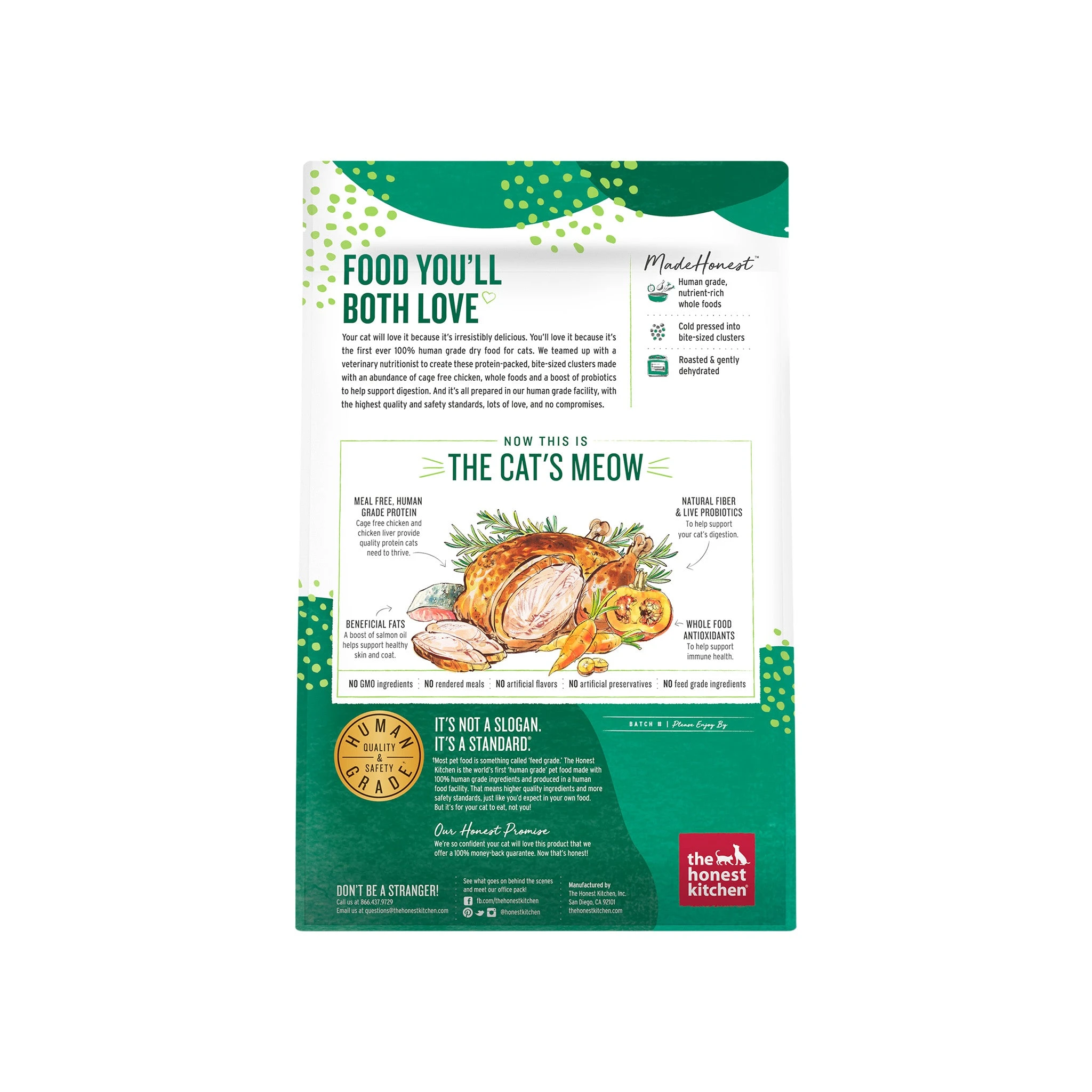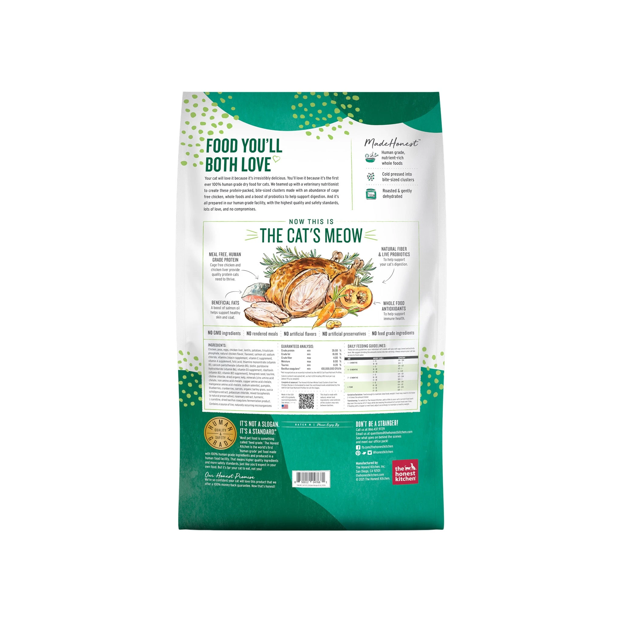 The Honest Kitchen Whole Grain Food Clusters Cat Food is irresistibly delicious. You’ll love it because it’s the first ever 100% human grade grain free chicken cat food. A veterinary nutritionist created these grain free, protein-packed, bite-sized clusters made with an abundance of cage free chicken, whole foods and a boost of probiotics to help support digestion. This grain free chicken cat food recipe is prepared in a human grade facility with the highest quality and safety standards, lots of love and no compromises. *Substantiated by In-Home AAFCO Feeding Trial
