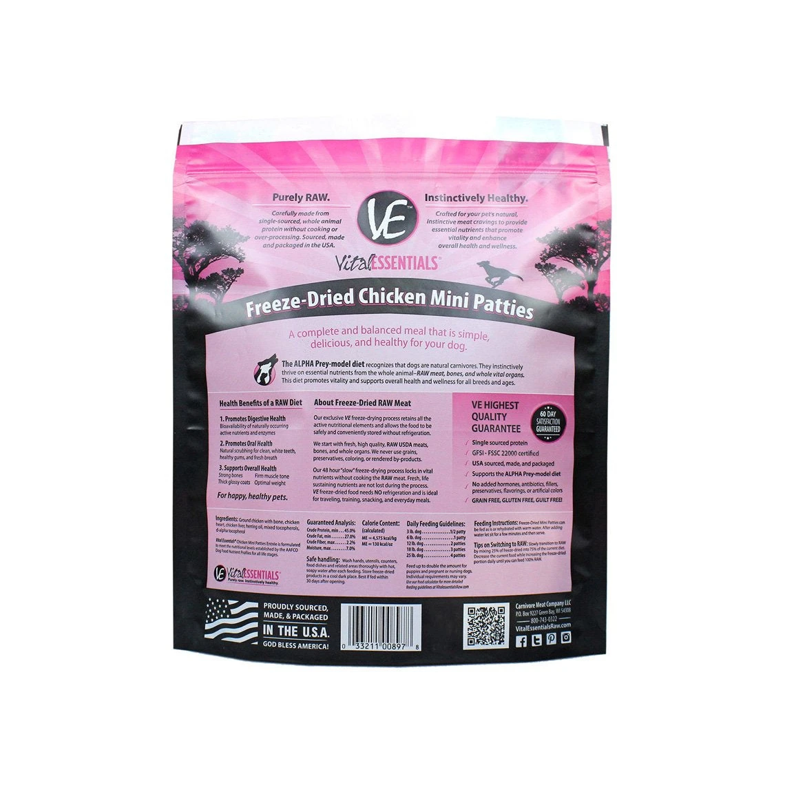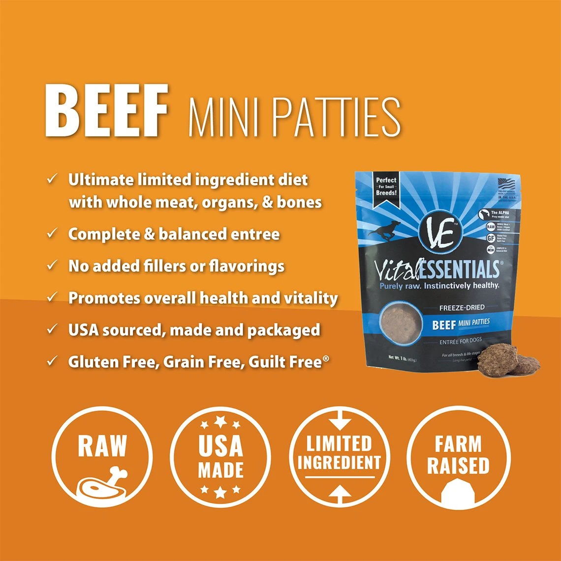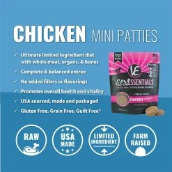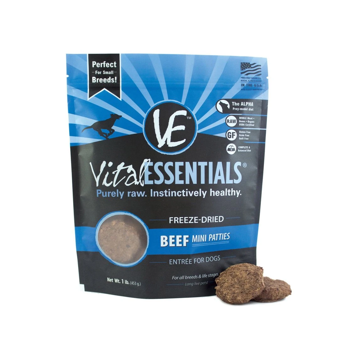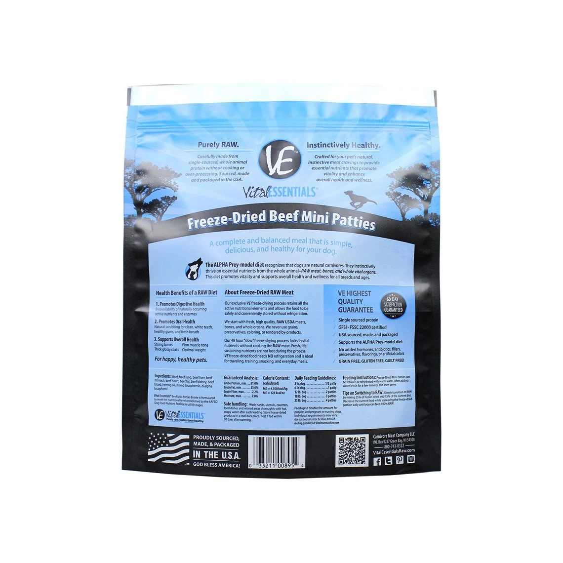 Made from the freshest, high quality, USDA meats, meaty bones and whole organ meats, you will never find grains, fillers, preservatives, coloring or rendered by-products in any Vital Essentials Freeze Dried Mini Patties.